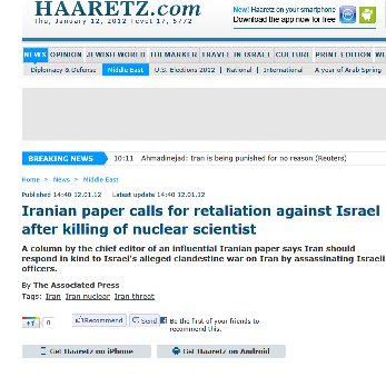 Sin embargo, según el diario israelí Haaretz, las sospechas iraníes de una provocación de Israel reforzaron la percepción de que el asesinato ha sido parte de una campaña organizada y clandestina para hacer retroceder las ambiciones nucleares de Irán, que Estados Unidos y sus aliados sospechan que están encaminadas a producir armas, mientras que Irán sigue afirmando que su programa es exclusivamente para fines pacíficos. También en una columna del periódico iraní Kayhan firmada por su redactor jefe Hossein Shariatmadari se pregunta por qué Irán no tomará represalias. "Los asesinatos de funcionarios y militares israelíes son fácilmente posibles". El ataque —en el que murieron instantáneamente el científico y su conductor el miércoles— fue como mínimo el cuarto dirigido contra un miembro de confianza de la inteligencia nuclear de Irán en dos años.